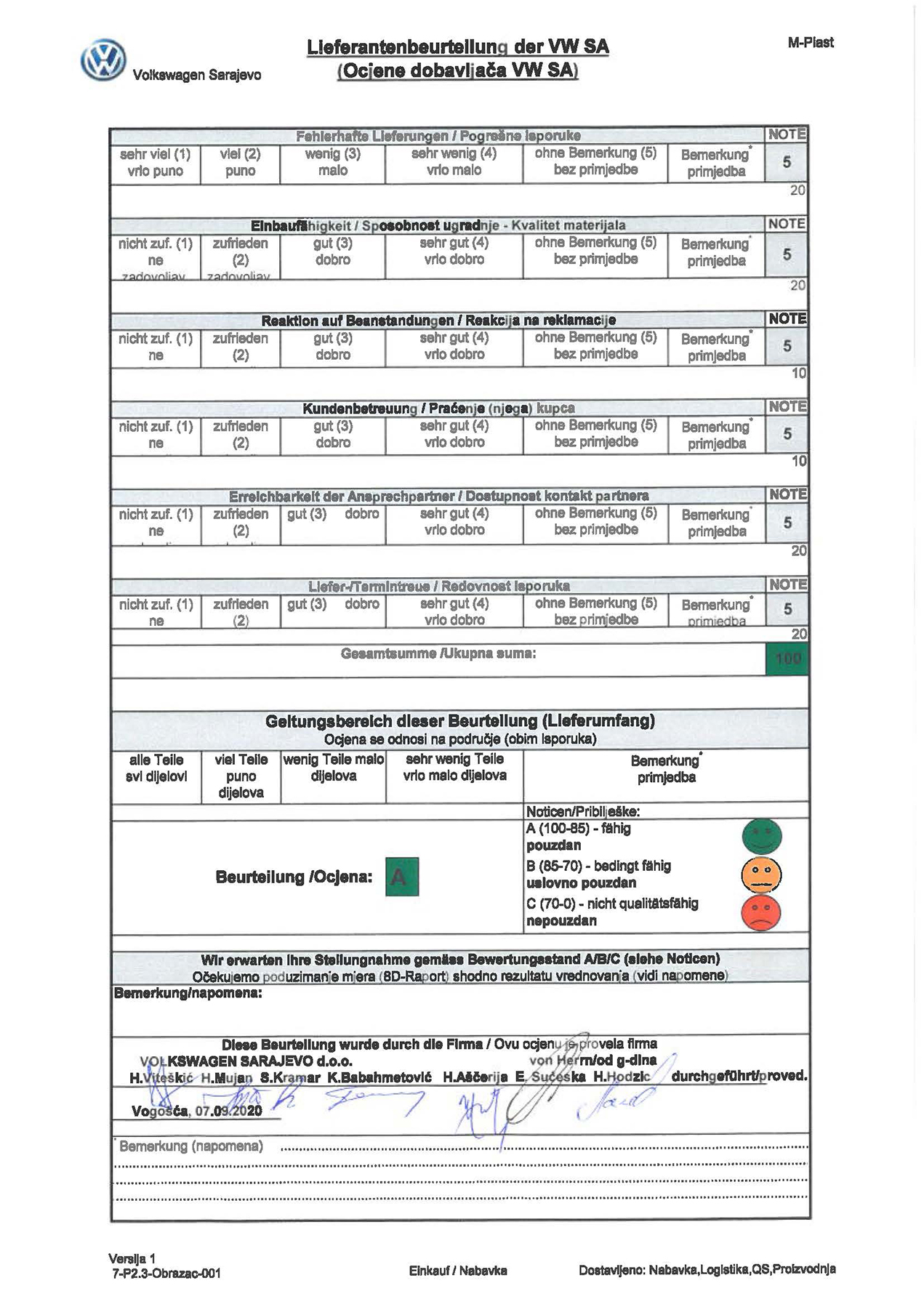 Ocjena za dobavljača od strane kompanije VW BiH za 2020. godinu