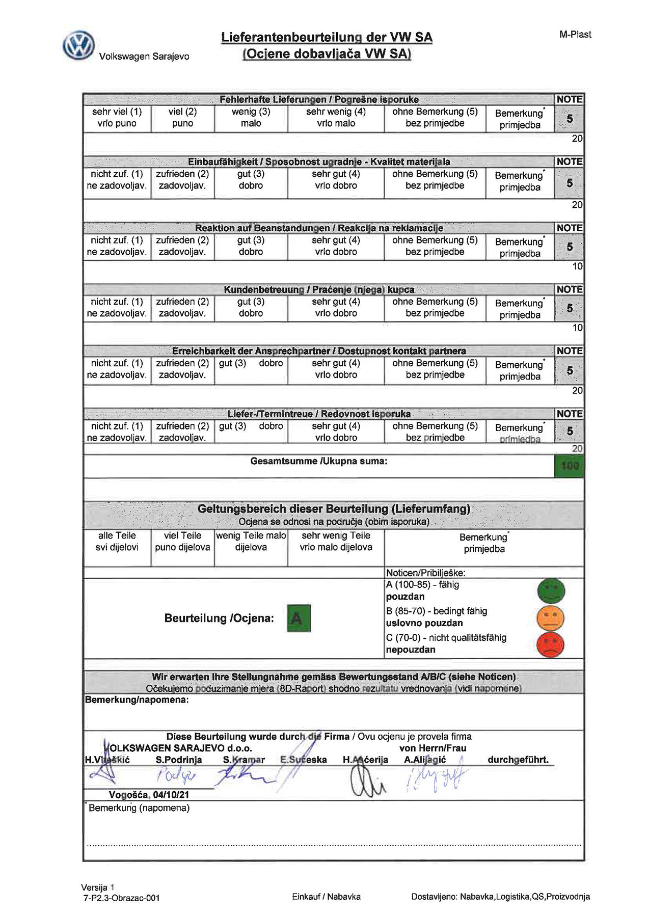 Ocjena za dobavljača od strane kompanije VW BiH za 2021. godinu