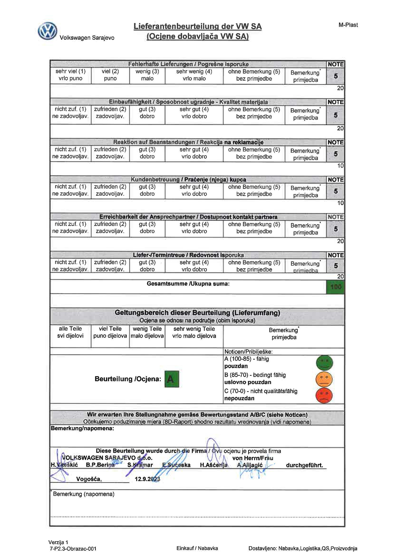 Ocjena za dobavljača od strane kompanije VW BiH za 2023. godinu
