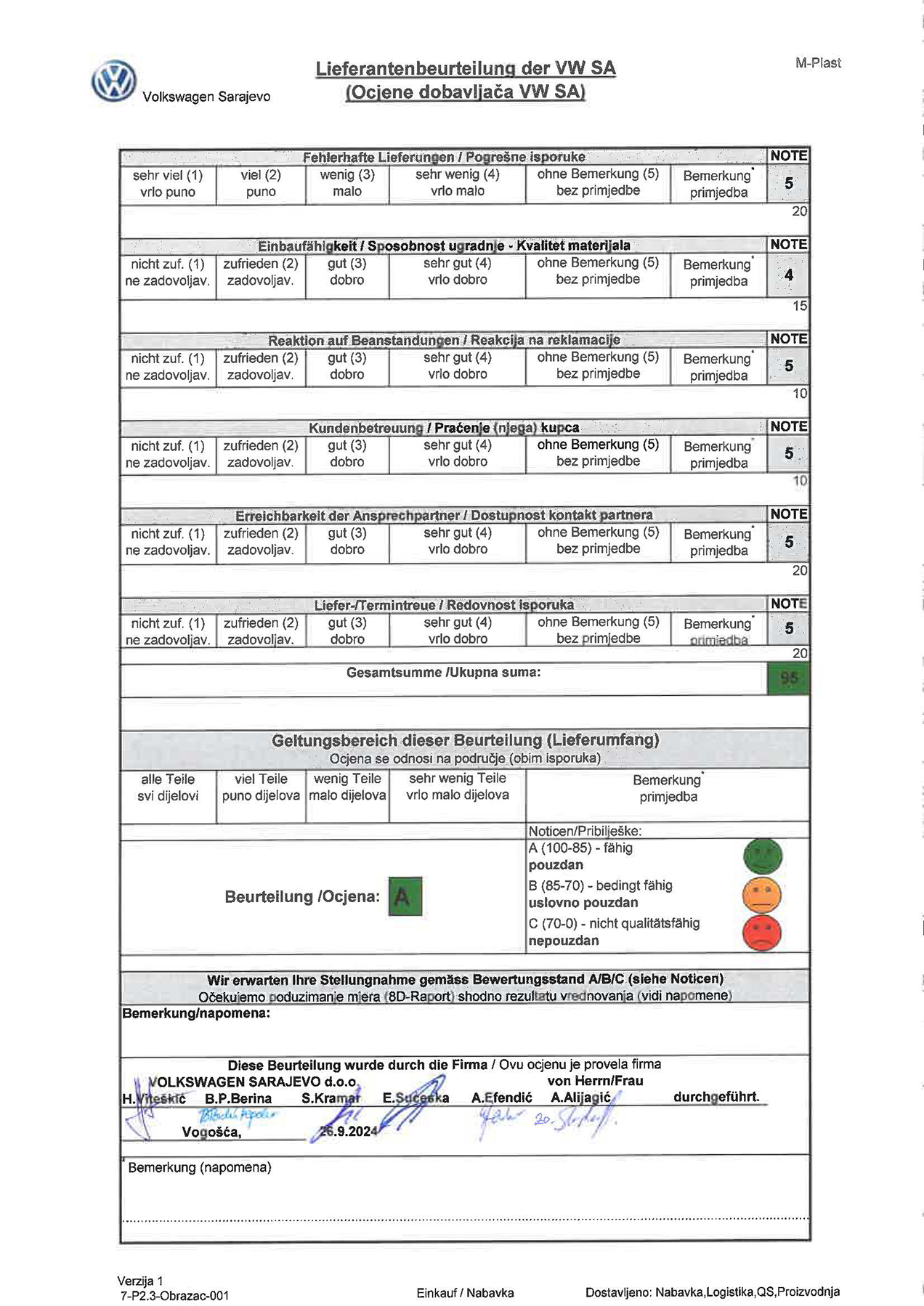 Ocjena za dobavljača od strane kompanije VW BiH za 2024. godinu