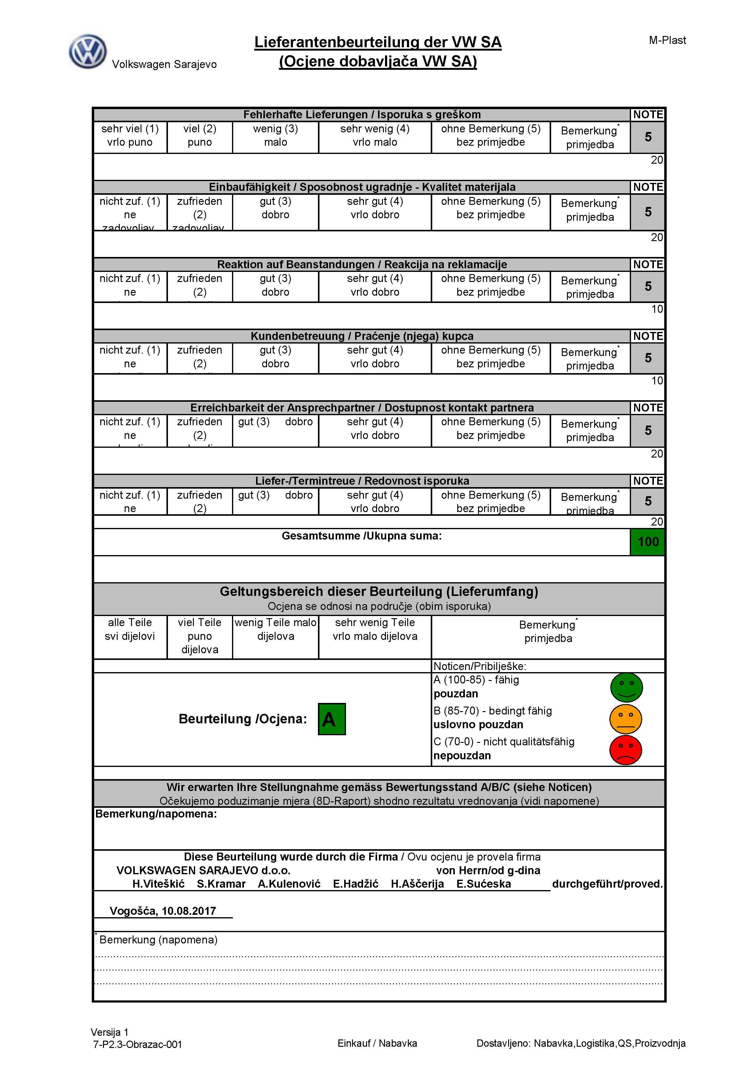 Ocjena za dobavljača od strane kompanije VW BiH za 2017. godinu